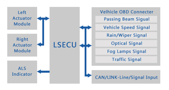 LSECU can detect the vehicle chassis leveling change, according to the suspension leveling change data and speed signals through a complex calculation and control logic then dynamically driving DC motors or actuation module to adjust the headlamp low beam illumination angle to ensure the appropriate lighting and safety for the driver.